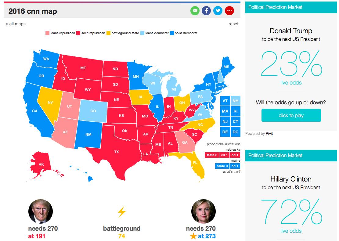 (注意,不要看色块的大小,中部很多州都没有多少人口... 大选获胜需要赢得538张选举人票中的270或以上。此截图旁边的百分比并不是预测的选票分配,而是odds,可以看作是个实时概率吧,当然了,这是CNN,换做FOX news,川普的数字会好看一点)