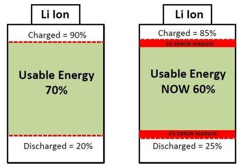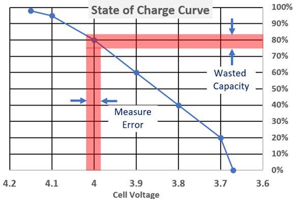 精度是电动汽车电池电量测量的一个重要特性。而电动汽车动力电池材料多样。包括磷酸铁锂LiFePO4电池(红色曲线),钴酸锂电池LiCoO2电池(蓝色曲线)和新化学材料电池如三元素NMC电池(黑色曲线)。它们对电池电量测量提出了不同的要求。对于磷酸铁锂LiFePO4电池,其放电曲线平缓,电芯电压测量精度至关重要。为了防止过度充电和放电,电池单元应保持在满容量的20%到90%之间。在85kWh的电池中,可用于正常行驶的容量仅为60.9 kWh。如果测量误差为5%,为了继续安全地进行电池运行,必须将电池容量保持在25%至85%之间。总可用容量已从70%减少到了60%。