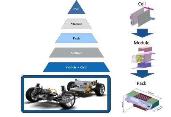 电动汽车动力电池是由最基础的电芯Cell组成电池模块Module,再由模块Module组成电池组Pack。而手机为单体电芯。电动汽车电池由几节电池串联组成。一个典型的电池组(具有96节串联电池)以4.2 V充电时会产生超过400 V的总电压。电池组中的电池节数越多,所达到的电压就越高。所有电池的充电和放电电流都相同,但是必须对每节电池上的电压进行监控。为了容纳高功率汽车系统所需的大量电池,通常将多节电池分成几个模块,并分置于车辆的整个可用空间内。典型模块拥有10到24节电池,可以采用不同配置进行装配以适合多个车辆平台。模块化设计可作为大型电池组的基础。它允许将电池组分置于更大的区域,从而更有效地利用空间。