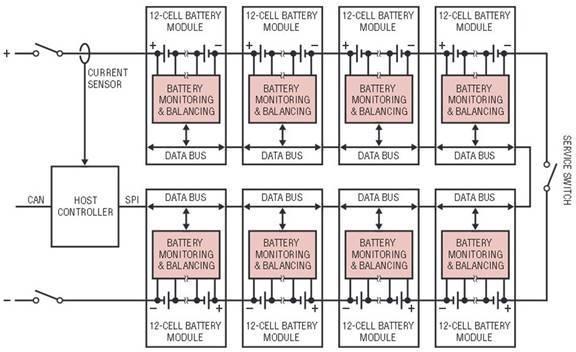 电池管理系统BMS应用框图显示了一个典型的具有 96节电池的电池组,分为8个模块,每个模块12个电池单元。在本示例中,电池IC为可测量12节电池的LTC6811。该IC具有0 V至5 V的电池测量范围,适合大多数电池化学应用。可将多个器件串联,以便同时监测很长的高压电池组。该器件包括每节电池的被动平衡。数据在隔离栅两边进行交换并由系统编译,该负责计算SOC、控制电池平衡、检查SOH,并使整个系统保持在安全限制内。