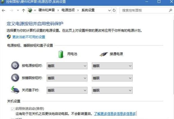 5、点击菜单中的“选择电源按钮的功能”会打开“控制面板\硬件和声音\电源选项\系统设置”。如图: