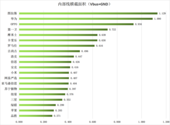 数据线的充电线内部横截面积直接影响数据线的充电和数据传输快慢,横截面积越大,数据线能承载的充电电流越大,阻抗越小,发热也越小。本次测试结果显示,图拉斯、华为、OPPO数据线内部横截面积位列前三,分别为1.129mm2、1.090mm2、0.934mm2。