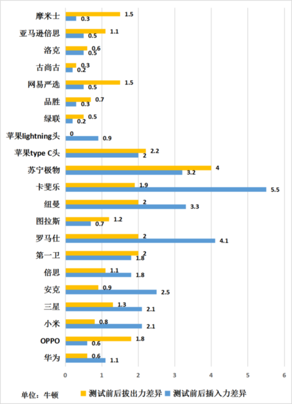 Lightning接口测试前后插拔力差异总体上比Type C 接口小,Lightning接口插入力前后差异全部在1N以下,拔出力差异最大为1.5N。Type C接口插入力差异最大为5.5N,拔出力差异最大为4N。不过值得注意的是,Type C接口也有插拔力差异很小的,华为测试前后插入力差异和拔出力差异分别为1.1N和0.6N,与其他Lightning接口的产品数据相近。
