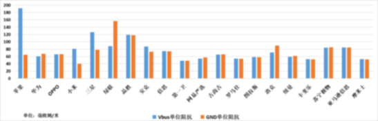 阻抗测试结果显示,第一卫的单位阻抗最低, 摩米士紧随其后,绿联的单位阻抗最高。单位阻抗低,说明数据线的焊接质量高,导电材料用料较好,使用时数据线发热更小,能量损失更少。