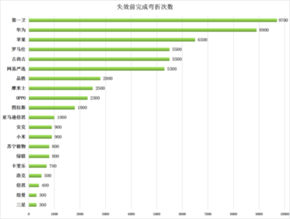 从机械弯折数据可以看出,弯折表现与数据线外被材料是否为编织线无必然联系。消费者在使用数据线时,应避免数据线频繁地弯折;需要弯折的情况下,应尽量减小弯折角度,避免对折的情况,以减少数据线因过度弯折导致内部结构损坏而无法使用的风险。