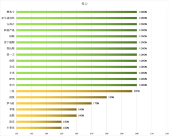 测试结果发现,摩米士、亚马逊倍思、古尚古、网易严选、绿联、苏宁极物、图拉斯、第一卫、倍思、安克、小米、OPPO和华为拉力均达到了最大测试力200N,且测试后功能完全正常,表现优异。
