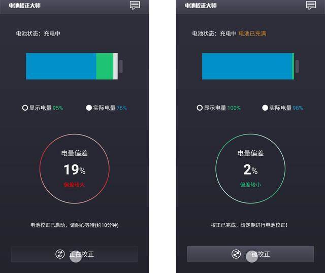 矫正时需要连接手机充电器,手机充电中打开APP,手机电池校正中会显示实际电量和系统显示电量,然后点击矫正,在十分钟左右的时间内,软件会不断匹配手机的系统电量和实际电量,直至误差到最小。