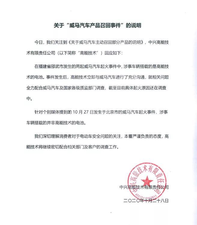 不过,针对10月27日北京一辆威马汽车发生的自燃事故,中兴高能予以了否认,称其生产的电池仅搭载于福建邵武起火事件中的涉事车辆。
