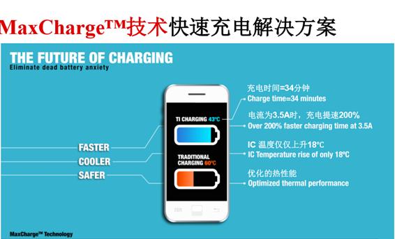 MaxCharge技术:是业内首款采用专有MaxCharge技术的全集成5A单节锂离子(Li-ion)电池充电器电路。与现有电池充电器相比,这款器件将充电时间减少了一半以上,最高可将充电时间减少60%,这让用户可以实现快速充电的同时又不会受到发热过量的困扰。