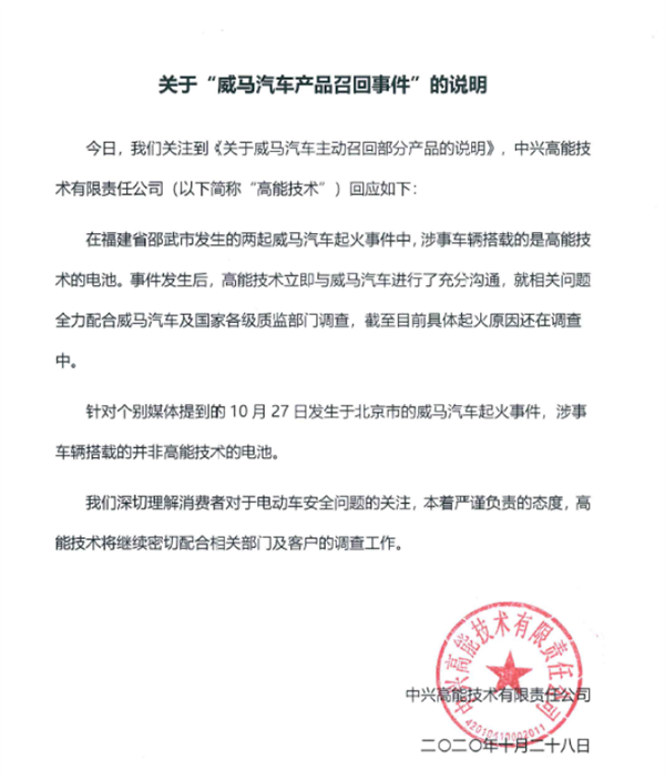 10月28日,中兴高能在其微信公众号回应称,在福建省邵武市发生的两起威马汽车起火事件中,涉事车辆搭载的是中兴高能的电池。但27日北京威马汽车电池爆炸并非高能电池。