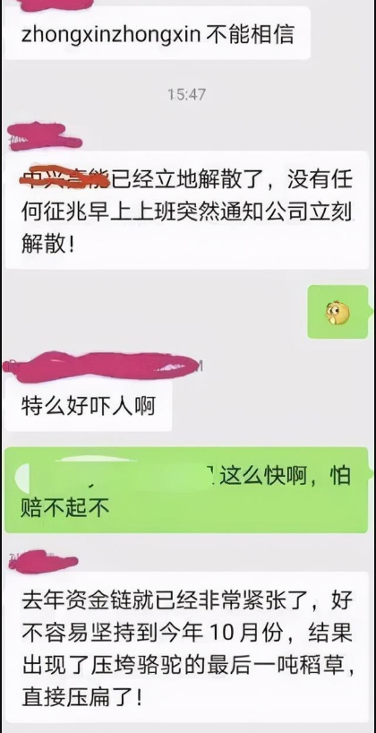 曝光的截图内容显示“去年资金链就已经非常紧张了,好不容易坚持到今年10月份,结果出现了压垮骆驼的最后一吨稻草,直接压扁了”。