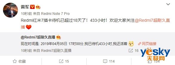 今天下午,@Redmi7超耐久直播 最新一条微博显示:“现在时间是: 2019年04月05日 17时00分,我已待机433小时,我还活着”,雷军也转发了这一条微博:“Redmi红米7插卡待机已超过18天了!433小时!”