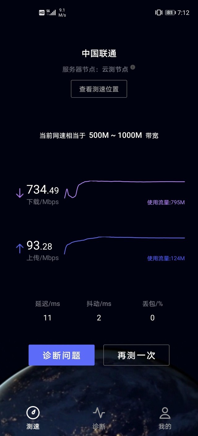 使用华为官方出品的“一键测速”(在华为应用商城搜索“一键测速”,即可下载使用),5G速率实测结果为:下载速率为734.49Mbps,上传速率达到了93.28Mbps,这个成绩符合联通5G套餐的网速。而这样的5G网络速度是大幅度优于4G网络的。