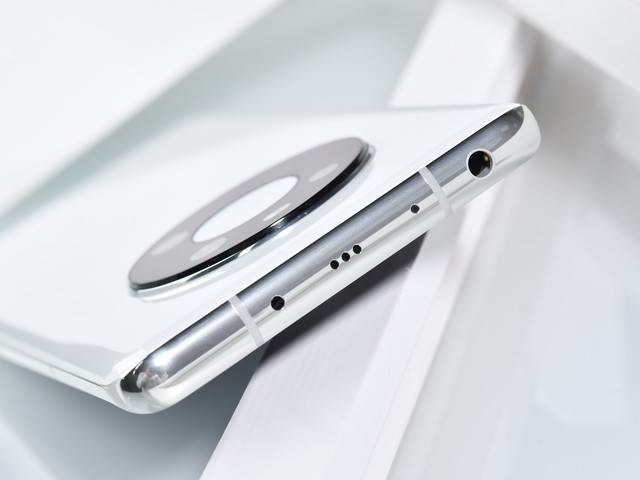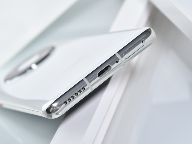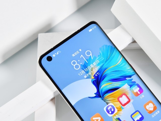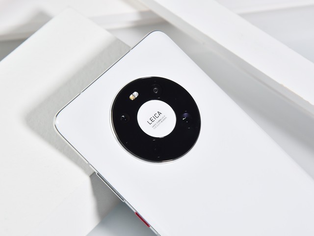 机身背面采用2.5D弧面设计,握持手感不错。我们拿到的这款华为Mate40为釉白色,配备黑色“星环”,颜色搭配纯粹经典,久看不腻。
