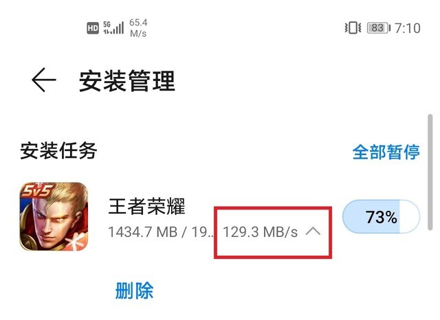 5G网络环境下,华为Mate40的5G软件下载速度表现也是极为优秀的,下载峰值速率可达到129.3MB/s左右,《王者荣耀》在短时间内下载完成。