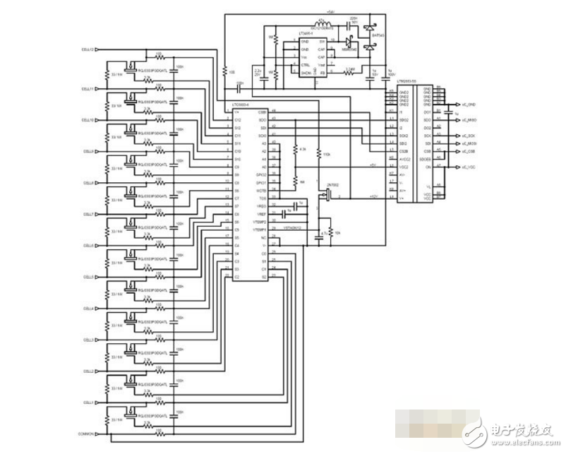 在上面实现的这些结构中,都有一个常见的测量功能构件,该构件包括一个多通道 ADC、安全隔离势垒和某种程度的本地处理能力。图 2 电路显示了一个实现数据采集功能的可扩展设计平台。在这个图中,实现功能的核心组件是凌力尔特的 LTC6803 电池组监视器 IC,同时显示的还有一个 SPI 数据隔离器和一些可选的特殊用途电路。该电路包括输入滤波器和无源平衡功能,构成了一个完整的 12 节电池数据采集解决方案。如果需要,这类电路可以简单地复制,以支持更多电池测量方案,同时共享主微的本地 SPI 端口,该主微反过来再提供外部 CAN 总线或其他 LAN 型数据链路所需。