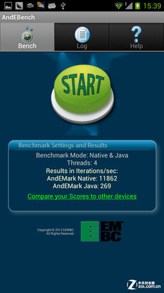 AndEBench是2012年发布的一款软件,其提供了一种评估Android平台性能的方式,能够测试CPU和Dalvik(Dalvik是Android系统中的虚拟机,是在Android设备中负责运行应用程序的软设备,因此也是Android整体中的主要部分之一)性能,并对比不同设备的本地和Java性能的不同。这款测试软件也可以证明一个平台的多线程性能,其最终的跑分分为了针对本机预装应用的执行效率(AndEMarkNative)和针对另行安装的第三方应用的执行效率(AndEMarkJava)两个方面。