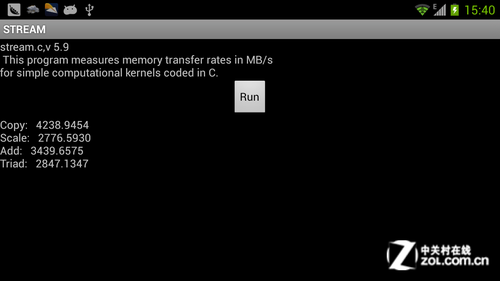 Memory(Stream)是一款内存测试软件,通过其中Copy(数据复制)、Scale(容量)、Add(添加)和Triad(综合)几个分项和综合成绩的测试分值高低可以了解到手机的内存管理性能高低,分值越高,证明该设备的内存管理性能越好。