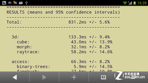 Sunspider0.9.1针对的是浏览器测试项目,通过设备内置浏览器对多种数据、包括图形等显示速度的快慢来考量该浏览器的优劣,其中包括的测试项目非常繁琐,通过对3d、access、bitops、math、string等等项目的测试得出一个总分,分值以毫秒(ms)记录,最终数值越低,即时间越短,证明该浏览器性能越好。