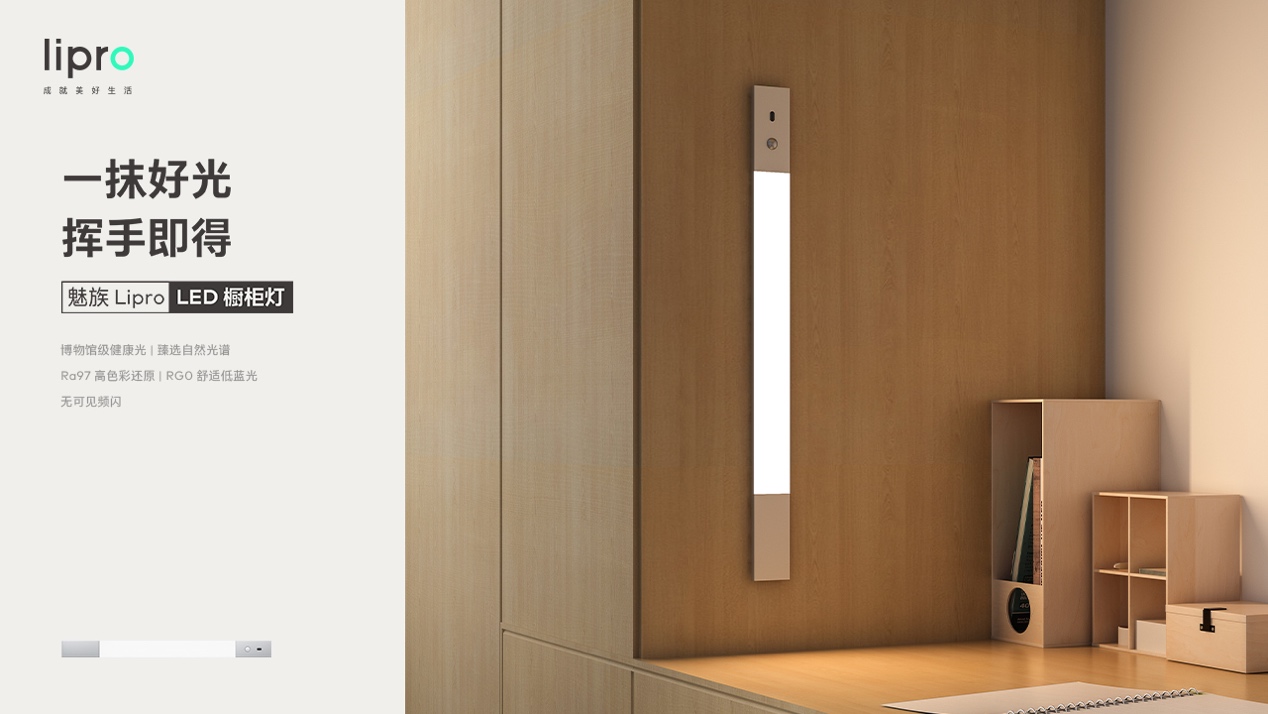 Lipro LED橱柜灯采用铝合金灯体,在侧布光的基础上,对柔光罩做了溢边处理,让光线更加柔和。同时Lipro LED橱柜灯内置两种不同感应方式:当环境亮度低于10lux,并检测到红外时,便自动点亮;或者用户手掌在灯体下轻扫点亮。Lipro LED橱柜灯提供有线供电版和电池供电版两种型号选择,有线元。电池供电版本使用了一颗 2000mAh的电池,魅族称其最长可提供4个月的续航,同时其采用了Type-C接口,方便充电。