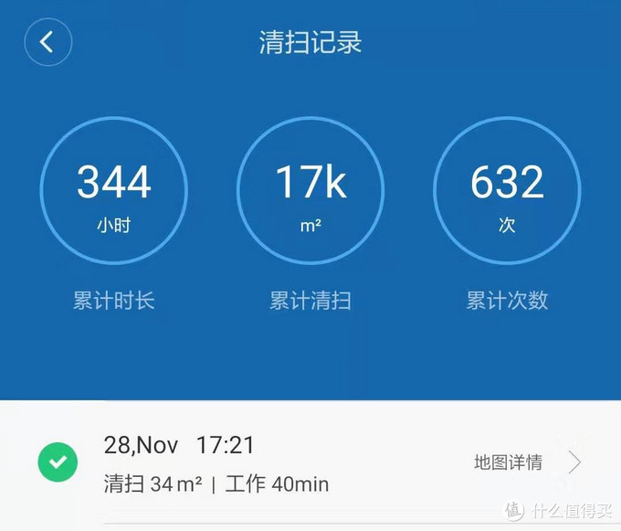 在2016年-2017年使用量比较大,在2018年下半年后,孩子读小学后,在学校附近住,就基本定时在每周打扫一次,到现在总共使用了344个小时,630多次。比起其他值友,我家是小地方。