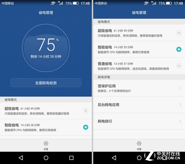 除了大容量电池外,在系统层面上进行的省电优化和电量管理也非常到位。在设置中可以找到省电管理的选项,包括超级省电、智能省电、普通省电三种模式,通过调节CPU的使用率、功能的开关来延长续航时间。