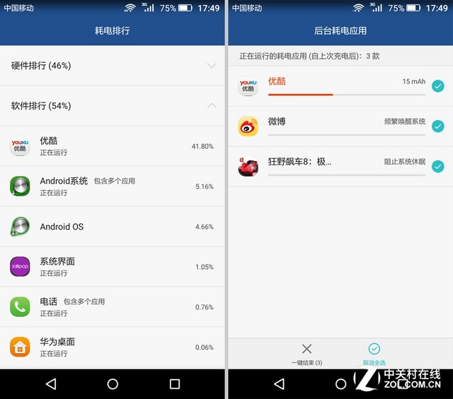 在省电管理中还可以查看硬件和软件耗电量的排名,以及后台耗电应用。如果手机电量使用过快,就可以通过查找来揪出“耗电元凶”,及时关闭以节省电量。