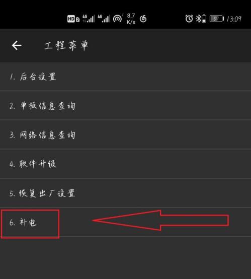 2.之后我们在“工程菜单”界面里,我们可以看到最后有一个选项是“补电”,我们点击“补电”,跳转界面后会提示你连接充电器。