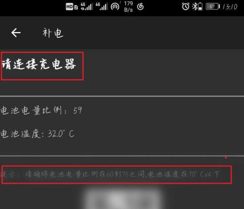 3.然后我们可以看到当前页面提示“请确保电池电量比例在60到75之间,电池温度在70°以下”,连接上充电器后,系统显示补电中。