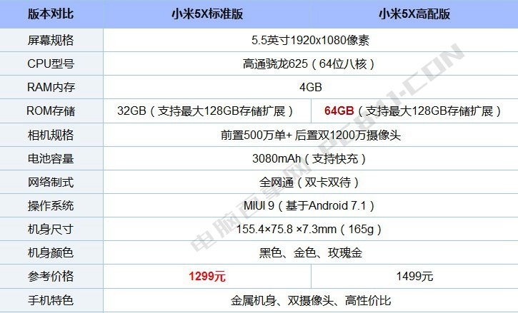 小米5X采用金属机身设计,背面设计酷似iPhone7 Plus,颜值不错。目前该机有2个版本,具体硬件配置参数如所示。