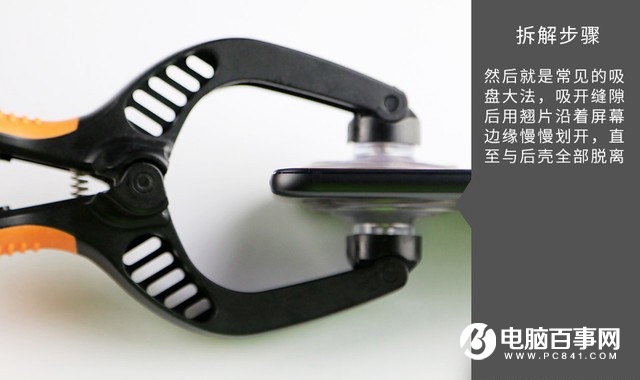 第二步:拆卸后盖固定螺丝后,就可以借助专业吸盘分离后盖了,吸开缝隙后,沿着屏幕边缘慢慢划开,直至与后壳全部脱离,如图所示。
