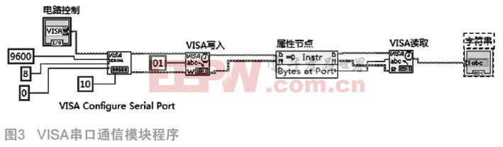 如前所述,本文中所涉及的通信全部是RS232通信。在LabVIEW中使用串口通信,需要借助LabVIEW提供的VISA库完成。VISA(Virtual Instruments Software Achitecture)虚拟仪器体系结构是VXI——即插即用联盟规定的标准I/O接口软件,是目前仪器设备接口类型功能函数的超集[10]。LabVIEW环境自带VISA的API函数,支持串口的读写、开闭及配置等操作。因此通过VISA可以实现任何类型的串口通信应用。如图3为通信串口的配置和读写程序[11-12]。程序首先配置串口通信参数为9600波特率,8位数据,零校验和1位停止位。程序通过使用串口字节数属性以读取所有接收到的数据。