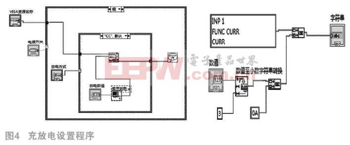 本文程控直流电源和电子负载使用艾德克斯的大功率产品,作为程控设备采用的指令是SCPI指令。SCPI指令是一种用于可编程仪器的标准指令集,SCPI指令包括IEEE.2标准中的通用指令和设备特定指令。本文用到的是设备特定的指令,主要包括设置充放电参数、测量电压电流及启动与停止指令。其指令格式为:关键字:参数。电源提供的充电方式包括恒压充电和恒流充电模式,电子负载还提供恒功率和固定电阻放电模式。因为充电时需要考虑在测试容量时有恒流转恒压的充电过程,因此需要设置充电电流和充电电压。放电过程则只需要选择某种特定的方式即可,不同方式对应于不同的SCPI指令,因此,在编写这个部分时采用枚举变量选择case结构进行设置。