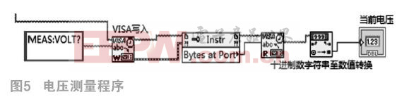 对于数据采集,主要是通过直流电源和电子负载远端测量端子和输出/入端构成的负反馈回路,测量得到精确的电池端电压及输入/出电流大小,并以ASCII码形式上传到上位机进行处理。设备上传数据需要得到上位机程序的指令才能进行。这里需要用到两条指令,即“MEAS:CURR?”和“MEAS:VOLT?”。平台设置的采集时间间隔为1秒。这一部分放在主程序循环之中。测量电压的程序图如图5所示。