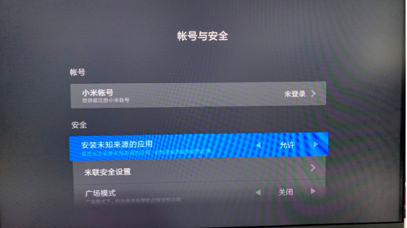 第四步:如果盒子提示“禁止安装”,则须打开【设置】——【账号与安全】,允许【安装未知来源的应用】