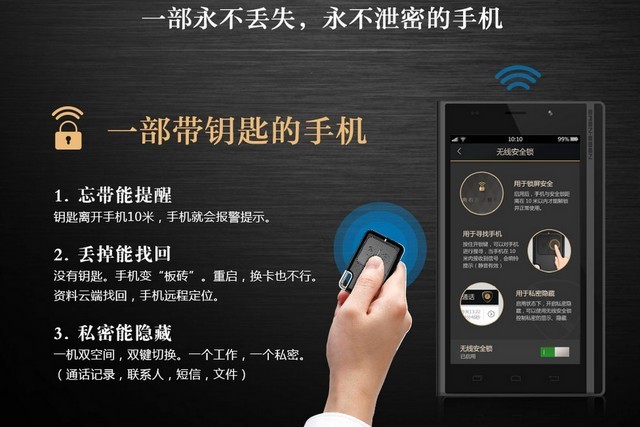 E人E本官方对于这款手机的定位是这样的:一部永不丢失,永不泄密的手机。在这两个方面,M1标配中所带的那把钥匙有着关键性作用。当你开启无线安全锁着一设置时,手机与钥匙距离相差10米,手机就会报警提醒。并且这个时候,M1将会变成一块“板砖”——开不了锁,重启也不行。