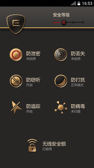 E安全有以下几个功能:防泄密、防丢失、防、防打扰、防追踪、防病毒。这看起来似乎与那些安全管家没有多大差别,实际上E安全要做的更为细致,虽然我们并没能找个病毒实际测试以下。