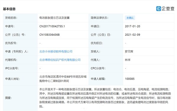 近期再企查查App中可以看到,小米公司近期公布“电池膨胀提示方法及装置”专利,由罗文辉发明。