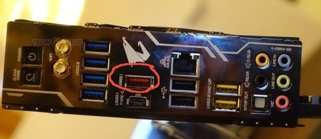 。USB3.1 Gen2的Type-C接口在笔记本上并不常见,而在部分台式机主板上可以看到USB-A形态的3.1Gen2带宽接口。画圈红色的就是Type-A形态的USB3.1 Gen2接口.