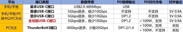 】分类这部分为了让大家看得更直观,我制作了表格,对于目前五类主流Type-C进行了分类。由于USB3.2和英伟达Virtual Link两者还没有大规模上市,所以暂时没有纳入。