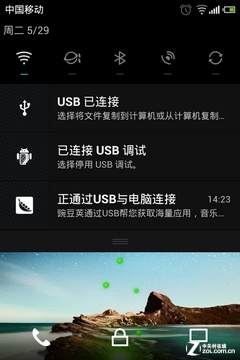 Flyme OS 1.0当中的锁屏界面还增加了下拉状态栏,也就是我们进入系统主界面中才能看到的那个状态栏;这就意味着可以在锁屏时直接对“WLAN、蜂窝数据、蓝牙、GPS”等进行开关操作。
