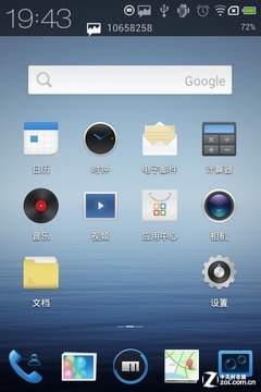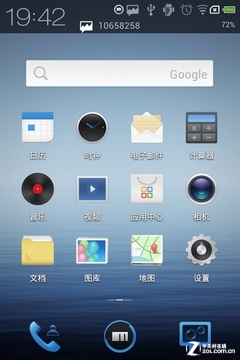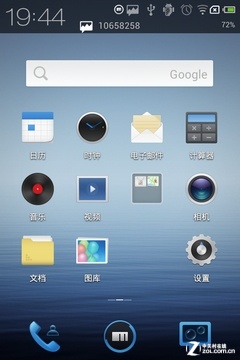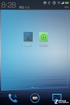我们所看到的桌面,除了时间、日期等信息依然被放置到左上角、右上角增加了电量显示这样的细节之外,改变最大的地方来自于焕然一新的程序图标以及分为两行的状态栏(上面一行留给系统工具状态、电量信号显示,而下面一栏专门用来显示来电、信息、下载等)。