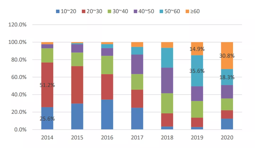 续航里程需求驱使,单车带电量显著提升。新能源汽车的动力来源是车载动力电池系统,车辆的续航里程主要由电池系统带电量和百公里电耗决定。目前提升车辆续航能力最直接的策略就是增加整车带电量,如优化车身结构以增加电池数量或选配能量密度更高的动力电池。工信部公布的各批次纯电动乘用车性能参数显示,2014年以来单车带电量显著提升。2014年大部分车型带电量在20~30kWh区间,占比为51.2%。2019年大部分车型带电量在≥50kWh区间,接近2014年的两倍。而2020年公示的车型中,单车带电量≥60kWh的车型占比达30.8%,相较2019年上升了15.9个百分点,增速显著。受益于续航里程的持续提升,新能源汽车单车电量持续提升的趋势短期不会改变。预计2021年推出的纯电动乘用车中带电量≥60kWh车型占比有望达到50%左右,有利于带动动力电池的需求。