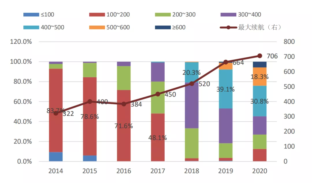 技术与政策双驱动,续航里程显著提升。续航里程一直以来是新能源汽车的行业痛点之一,也是消费者对新能源汽车望而却步的主要因素之一。近年来,随着动力电池技术的进步,辅以补贴政策的积极引导,新能源汽车的续航里程显著提升。迄今为止,工信部共公布三十一批《免征购置税的纯电动乘用车车型目录》, 2014年大部分车型续航里程在100~200km,占比高达83.7%。2014年以来续航里程逐年提升,最大续航里程已由322km提高至706km,增速显著。最近三年续航里程以每年接近100km的速度显著提升,2019年公示的大部分车型续航在300~500km区间,其中400km以上续航里程的车型占比为46.9%。而2020年公示的两批目录中,大部分车型的续航里程在400~600km,其中400km以上续航里程的占比为54.8%,相较2019年提高了7.9个百分点。在最新公布的补贴方案中,已将纯电动乘用车续航里程补贴门槛提高至300km。伴随着消费升级和行业竞争加剧趋势,预计后续除特定应用场景之外,低续航里程的车型逐渐会被淘汰,高续航里程的车型占比会逐年提升。预计2021年推出的纯电动乘用车中续航里程在400km以上的车型占比可以达到80%左右,最大续航里程有望达到800km左右。图2:各批推荐目录纯电动乘用车车型续航里程(km)