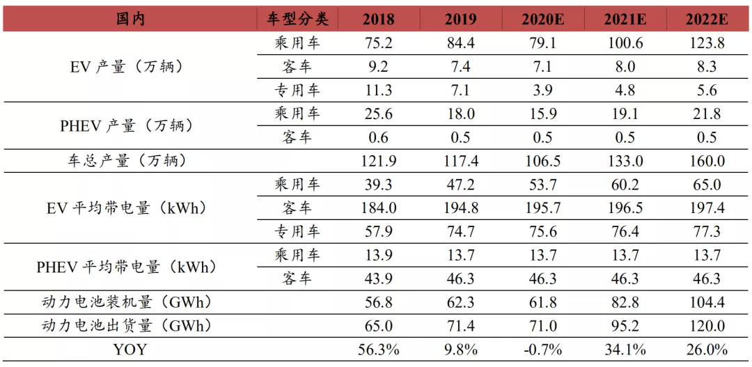新能源汽车销量继续承压。2019年受补贴退坡影响,叠加汽车市场整体下行的波及,我国新能源汽车销量首次出现负增长,同比下滑4%。2020年公共卫生事件在全球范围内大流行,汽车行业供给侧和需求侧均遭受严重冲击。1-5月我国新能源汽车销量为26.6万,同比下滑44%。基于三方面的原因:(1)随着公共卫生事件好转,前期积累的需求,尤其是B端需求有望得到释放;(2)为了对冲公共卫生事件影响,各地推出的新能源汽车补贴政策陆续落地,如北京2万辆新能源指标等;(3)下半年新车型投放加速,如磷酸铁锂版Model 3、比亚迪汉、小鹏P7等。第三季度新能源汽车市场有望由下滑期转向增长期,预计全年销量为106.5万左右,同比下滑12%,全年销量仍继续承压。2020年销量有望触底,未来迎来上升期。基于三个因素:(1)需求侧:用户对新能源汽车的认可度逐年提升,助力其渗透率呈上升趋势;(2)供给侧:近年来新能源汽车产品力显著提升,产品矩阵明显丰富,里程焦虑有所缓解,有望在明星车型Model 3的引领下提升行业景气度;新基建政策助力下,充电桩等配套设施短板有望得到弥补;(3)政策端:新能源补贴政策延长至2022年底,补贴标准分别在上一年基础上退坡10%、20%、30%,而动力电池售价下降有望对冲掉补贴退坡,未来两年迎来政策稳定期。未来2年有望迎来上升期,考虑到2020年公共卫生事件的影响,以补贴退坡后的2019年下半年销量数据为基数,折合全年销量约116万,预计2021、2022年销量分别有望达到133万、160万,增长率分别为15%、20%。未来新能源汽车拥有一定的增量空间,有利于带动动力电池需求。
