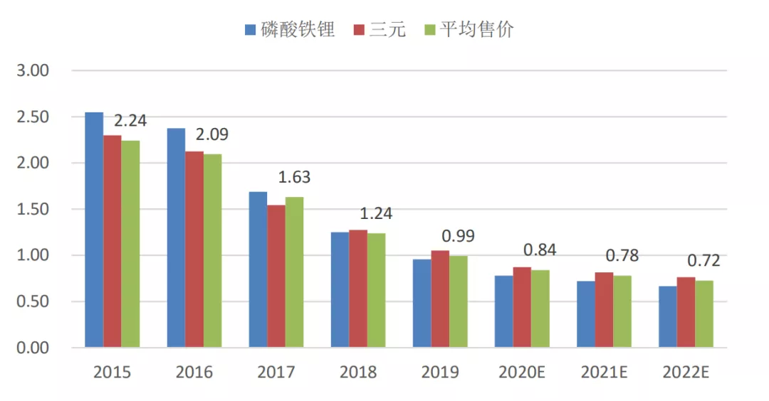 在下游整车平价诉求、上游原材料成本下降和自身制造成本下降三个维度助力之下,动力电池售价呈现逐年明显下降走势。2019年动力电池平均售价为0.99元/Wh,同比下降19.93%,降幅有所收窄。预计2020年三元、磷酸铁锂电池的售价分别为0.87、0.78元/Wh,粗略预估动力电池平均售价为0.84元/Wh左右,同比下降15.25%。考虑到上游原材料成本下降速率有限,预计2022年三元、磷酸铁锂电池的售价分别为0.76、0.66元/Wh,粗略预估动力电池平均售价约为0.72元/Wh,未来2年的年复合增长率为-9.93%。届时,新能源汽车与传统燃油车购车成本进一步缩小,有望于2025年实现基本平价。
