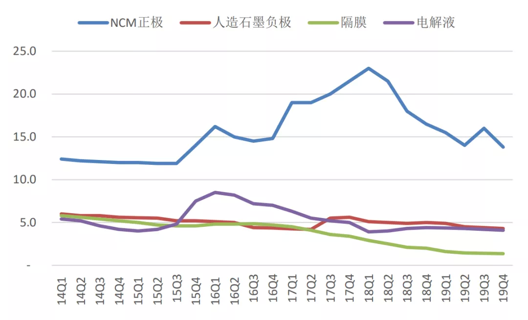 上游供给侧:原材料成本逐年下降,利好动力电池成本控制。动力电池上游原材料中最重要的是四大主材:正极材料、负极材料、隔膜、电解液。随着中国新能源汽车市场的崛起,国内形成了完整的动力电池原材料产业集群,其中四大主材的国产化率均在90%以上。经过前期供需关系转变和锂钴资源价格波动,受益于规模化效应、自动化率提高和竞争格局的加剧,四大主材的价格呈现逐年下降的态势。相较2018年Q1,2019年Q4正极、负极和隔膜的价格分别下降40.0%、15.7%、53.4%,降幅显著。而电解液价格维持在4万/吨左右,整体上略有下降。上游供给侧原材料成本的下降,利好动力电池成本控制。