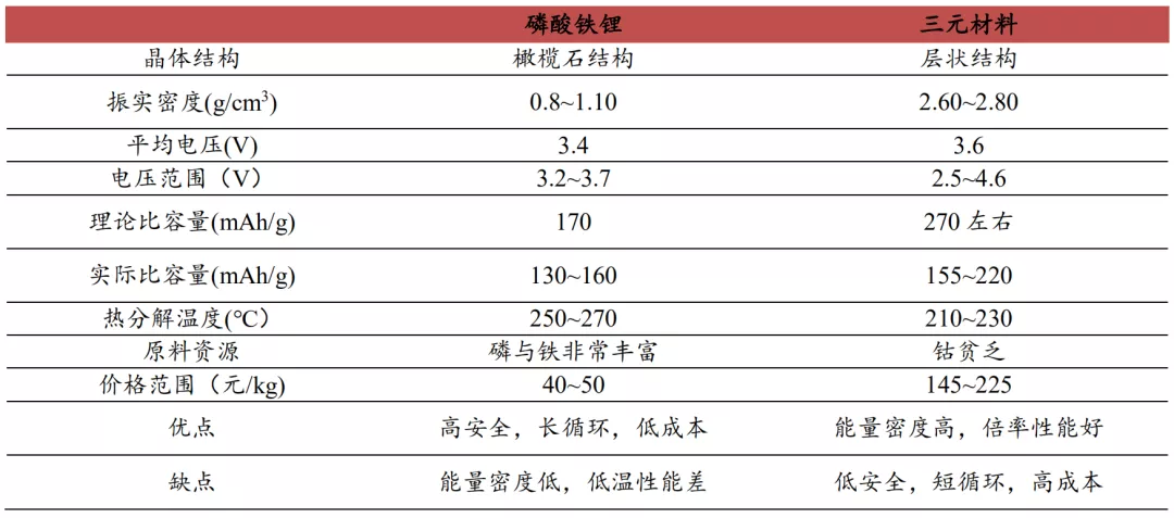 磷酸铁锂:低能量密度高结构稳定性,三元材料:低结构稳定性高能量密度。根据正极材料的种类,目前国内主流的动力电池分为磷酸铁锂电池和三元电池两种。磷酸铁锂是典型的橄榄石结构正极材料,锂离子完全脱出并不会造成橄榄石结构的破坏,因此具有较佳的结构稳定性。三元材料是典型α-NaFeO2层状结构,在锂离子脱嵌过程中容易造成层状结构的坍塌,因此结构稳定性较差。相较三元材料,由于较佳的结构稳定性和丰富的原料资源,磷酸铁锂具备诸多优势如:高安全性能、长循环性能与低成本。相反,三元材料由于较高的电压平台和比容量,能量密度优势显著。长远来看,磷酸铁锂能量密度已接近理论天花板,未来提升空间不大。而三元材料能量密度距理论值有一定的差距,未来仍有一定的提升空间。