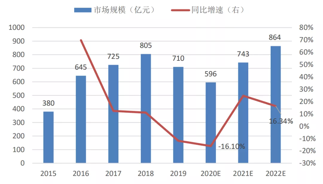 市场规模短期波动,未来仍有一定的增量空间。2019年受限于新能源汽车市场疲软,动力电池市场规模有所收缩,总市场规模为710亿元,同比下滑11.80%。从新能源汽车销量、单车带电量和动力电池售价三个维度出发,预计2020年动力电池市场规模约为596亿元,同比增长率为-16.10%。后续随着新能源汽车市场的回暖,预计2022年市场规模有望达到860亿元,未来2年复合增长率约为20%,仍有一定的增量空间。