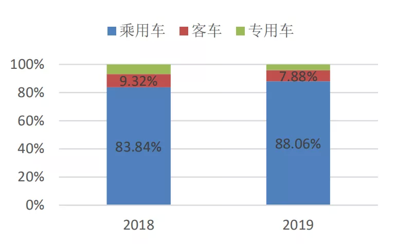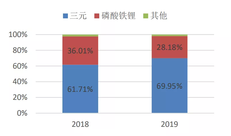 动力电池领域产品结构:三元为主、磷酸铁锂为辅。新能源汽车产品结构中乘用车占主导地位,2019年乘用车、客车、专用车的占比分别为88.06%、7.88%、4.06%,乘用车市占率相较2018年提升了4.22 pct,呈上升趋势。受益于下游新能源汽车产品结构,在政策补贴助力之下,动力电池领域形成了三元为主,磷酸铁锂为辅的产品结构。2019年三元和磷酸铁锂的占比分别为69.96%、28.18%,磷酸铁锂的占比不足三分之一。